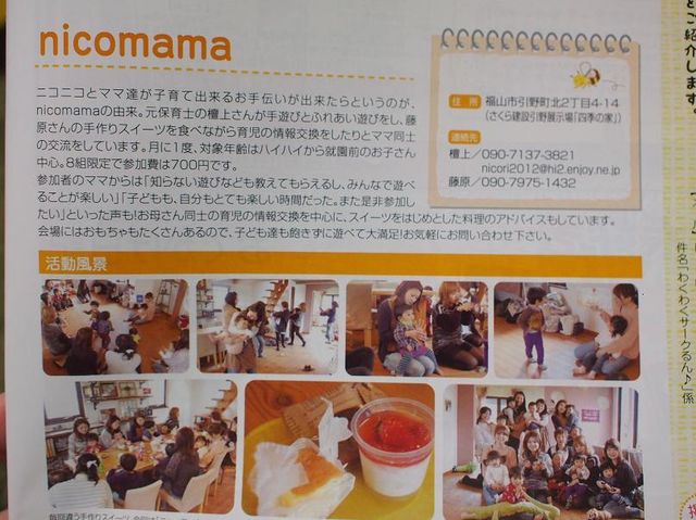 管理人様、貴重なスペースお借りします。 ママたちがニコニコと育児ができたらと思い、 月に一回nicomamaというサークル名で会を開いています(*^^*) 手遊びやふれあい遊びで子どもとふれあい、 その後手作りのスイーツを頂きながらママたちのおしゃべりタイムがあります。 たくさん笑って、リフレッシュしませんか?? 初めての方も毎回おられます! ぜひ、参加お待ちしています〜(*^^*) 『びんまる4月号』のサークるん♪のページに、先月の様子が掲載されています。(写真) 【日時】4月16日(火) 10時半〜12時 【