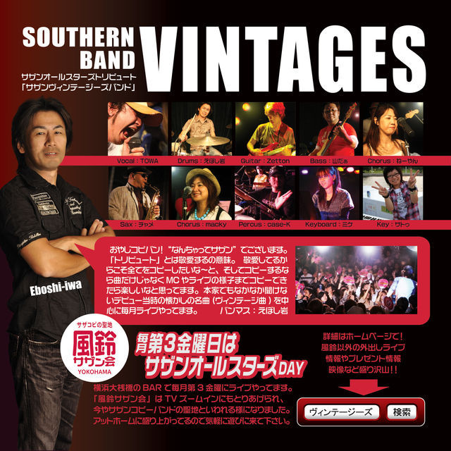 あの噂のライブがいよいよDVDに! 我がバンマスえぼ兄がまたまた作ってくれました。 「日本のサザンとユーミンと。」 http://mixi.jp/view_bbs.pl?id=73344599&comm_id=4535600 いつもDVDが出来るとメンバーでカラオケボックスに行き試写会をやってるんです。 今回はせっかく適任なお店が鶴見にあるのでw皆で先行試写会をしちゃおうかなとw 是非是非いらしてくださいませー! 因みにヴィンテージーズはリハでも揃わないのにこんな会は全員来ますw 是非一緒に呑みながら見ましょうー。 もしかしたら見終わったらミニアコLIVEやるか