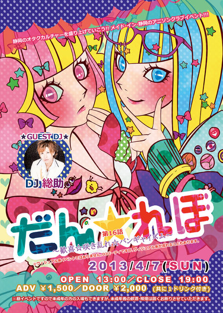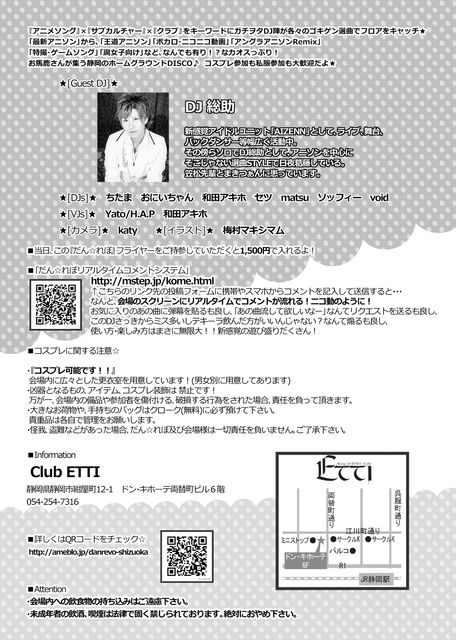 『アニメソング』×『サブカルチャー』×『クラブ』をキーワードにガチヲタDJ陣が各々のゴキゲン選曲でフロアをキャッチ★ 「最新アニソン」から、「王道アニソン」「ボカロ」 「ニコニコ動画」「アングラアニソンRemix」「電波曲・ゲームソング」 「腐女子向け」「特撮」など、なんでも有り!?なカオスっぷり! お馬鹿さんが集う静岡のホームグラウンドDISCO♪ コスプレ参加も私服参加も大歓迎だよ★ ☆☆開催決定☆☆ 静岡のオタクカルチャーを大いに盛り上げていこう!! メイド・イン・静岡のアニソンクラブDJイベン