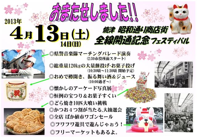 毎年恒例になりつつありますね。 たい焼き10匹チャレンジ大会 4月13日(土) 1:00〜 1:30〜 2:00〜 3:00〜 3:30〜 の計5回 参加費 大人1000円 子供300円 10分以内完食の方に賞金3000円 早喰いチャンピオンに賞金5000円 参加したい方は、私にmixiメッセージを 送って下さい。詳細を返信します。 『あんこは飲み物』(・∀・) ********************************** 今年は『たい焼き』だけではありません! 昭和通り道路拡幅工事終了を祝し、 全線開通記念フェ