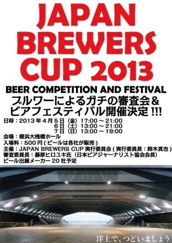 ブルワーによるビア・コンペティションとビアフェスティバルからなるイベント。 実行委員長 :鈴木真也さん(何と!) オブザーバー:藤原ヒロユキさん ビア・コンペティションは、ブルワー(醸造家)がジャッジ。 今回は「ヴァイツェン」部門と「ペールエール部門」が行われます。 そして、ビールファンにとってのお楽しみはビアフェスティバル。 会場:横浜大桟橋ホール 入場料:500円(ビール代は別) ビール出展メーカーは20社を予定。もちろんBAYも登場。 4/5(金) 17:00〜21:00 4/6(土) 13:00〜21:00 4/7(日) 13:00〜19