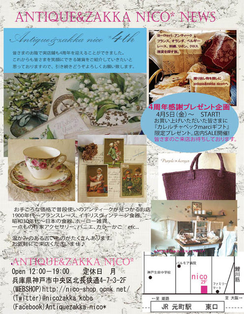 みなさ〜ん!! 5日(金)12時からはじまりました〜♪ 雨でも元気にオープンしてますので(笑) 遊びに来てくださいね〜♪ 只今4周年Anniversary感謝セールやってま〜す!! (日程) 4月5日(金) 12時より 【感謝SALE】 今から使いたいカゴバックも!! イギリス食器も!! ★ 5% 〜 50%OFF ★ (対象商品) マルシェかご、サイザルカラーかごバック、イギリスヴィンテージ食器、 昭和食器、レース資材。 ※数量限定セール価格にて販売しますので、お早めにご来店くださいませ♪