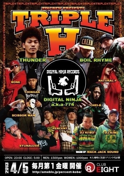 ZINCREW presents 【TRIPLE H 〜平成〜HOT〜HALL〜】 2013年4月5日(金) @CLUB EIGHT 神戸市中央区中山手通1-2-9 伸光ビルB1F Tel: 078-334-6606 OPEN/23:00〜CLOSE/5:00 OPEN〜1:00 MEN & WOMEN/1000(+1d) 1:00〜CLOSE MEN/2000(+1d) WOMEN/1500(+1d) 【SP GUEST】 TUHNDER BOIL RHYME DIGITAL NINJA a.k.a 774 【REGGAE DEEJAY】 BONE CHINGAN SCISSOR MAN 【HIP-HOP MC】 NATURAL P CHEI-B 【SOUND】 PERCENT SYUNAUZER 【DJ】 DJ KIM DJ KI-BO 【WAR