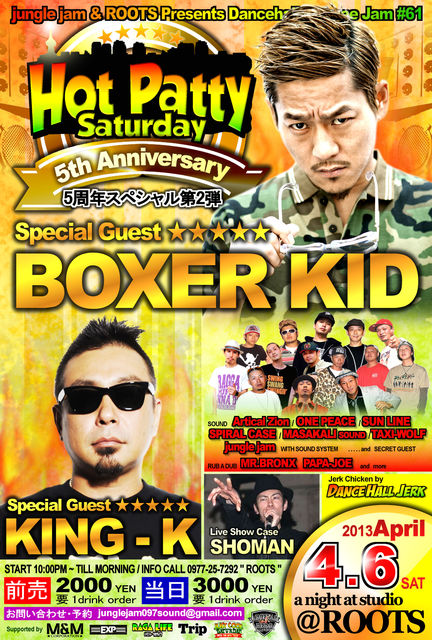 2008年から始まったHot Patty Saturdayも5年目を迎える事ができました。全ての方々に大感謝!この日はスペシャルゲストに大阪06マイティジャムロックからBOXER KID !