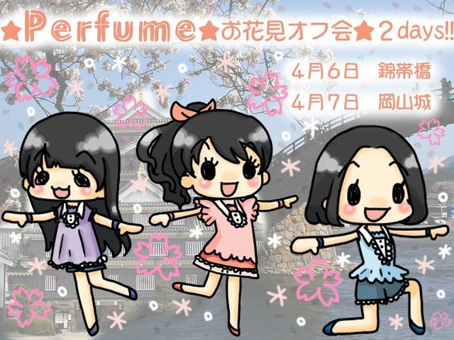 4/6錦帯橋、4/7岡山城でお花見します! ★★★★★3/24更新★★★★★ 桜の開花が早まりましたので4/6、4/7には見ごろを過ぎてしまう予定です。 あらかじめご了承ください。 Perfume中国地方コミュニティとツイッター合同で行います。 ★★★★★★★★★★★★★★★★★★★★ 暖かくなる今日この頃ですが皆様いかがお過ごしでしょうか。 さてさてお花見の季節がやってまいりました。 てことでPerfumeファンで集まってお花見オフ会やりましょう! たまには朝から夕方までゆったりPerfumeファンと語り合って飲み