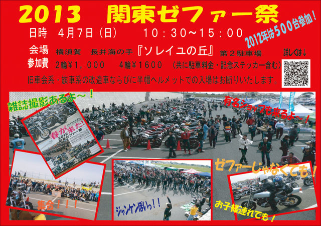 【関東ゼファー祭り2013】 皆様大変お待たせ致しました♪ しばらくプライベートでバタバタしてた&mixi自粛?してたんでUP遅くなりましたが、今年も行っちゃいますよん♪ ※ポチっとする方はドコで合流するかも記載お願い致しますm(_ _;)m 今年も行っちゃいますかぁ 今年も皆で参加しちゃいましょう♪ 一人ぢゃチョット淋しいって方は皆集まって一緒に行きましょう♪ 場所と時間は去年と一緒なんで、待ち合わせも一緒で良いですかね? 毎回参加している方も♪マダ行った事が無い方も♪ 楽しくおしゃべりし