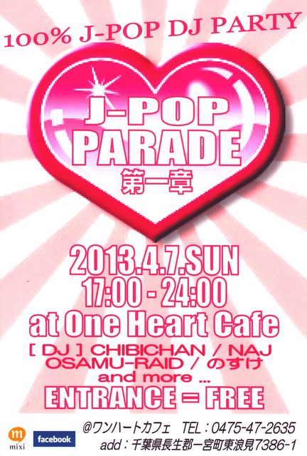 100% J-POP DJ PARTY 『J-POP PARADE』-第一章- @ワンハートカフェ 0475-47-2635 千葉県長生郡一宮町東浪見7386-1 4/7(日) OPEN : 17:00 CLOSE : 22:00 ENTRANCE=FREE [DJ] CHIBICHAN (Many Loves Years 2013) NAJ (TOP RANKIN') OSAMU-RAID (CLUTCH) PINKMAN のすけ (アニメロ放送部☆1810) 2013年ワンハートカフェ新イベント始動!! ジャンルはズバリ「J-POP」 「J-POP」という表記にしてますが、アーティストが日本人ならばジャンルは何でもOKです。 グループサウンド、フォーク、ソウル、演歌、童謡、ロック、