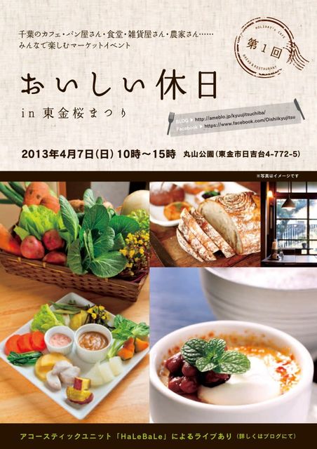 4月に入ったすぐの日曜日、 春気分満載で開催されるイベントにじんわりも出店します☆ このイベントもうご存知の方も多いかもしれません。 幹書房さんから発行されている 「休日のカフェめぐり」「休日のパン屋さん」「休日のごちそう食堂」 の千葉版に掲載されている店舗が集まるマーケットイベントです。 東金市が桜まつりで賑わう同じ日に開催されます! おいしい休日 in 東金桜まつり 日時:2013年4月7日(日曜日) 10:00~15:00 場所:丸山公園(東金市日吉台4-772-5) ameblo.jp/kyuujitsuchiba/ 「休日のカフェめぐり」