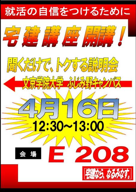 【★新生活も将来の就活対策も充実です★】 ガイダンス日程 4月16日(水)12:30〜 場所 E208教室 みなさん宅建って、知ってますか? 宅建=不動産業だけじゃない 不動産業に限らず、 建築・金融・保険・小売・外食産業など 幅広い分野で必要とされている資格です。 社会は、即戦力を求めている 学生時代に頑張った証として、 履歴書や面接でのアピールに非常に効果的です。 学生時代の今だからこそ 社会人になってから、仕事の勉強の両立は困難。 学生時代の今だからこ