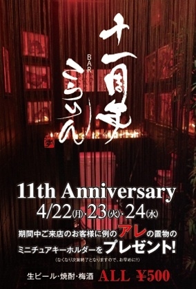 4月22日(月)23(火)24(水)の3日間 11周年記念を催します! 生ビール・焼酎・梅酒 ALL\500 そして期間中お越しのご希望の方に 当店、お手洗いの置物のミニチュアキーホルダーをプレゼント! 数量限定ですのでお早めに!