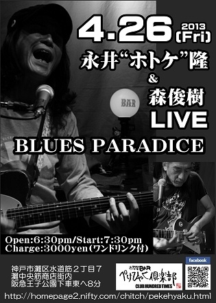 【BLUES PARADICE】恒例になってきました!!ホトケさんライブ♪♪ 伝説を目の前で!!間近で感じろ! 日本ブルース界の重鎮「ウエストロード・ブルーズバンド」 「blues.the-butcher」の永井“ホトケ”隆 レフティースライドギターの名手、森俊樹とのコンビ!! ■2013.4.26(Fri) BLUES PARADICE ■出演:永井“ホトケ”隆(Vo&Gt)/森俊樹(Vo&Gt) ■Open 18:30/Start 19:30 ■Charge 3000yen(ワンドリンク付き) *ぺけひゃくTシャツ着用でさらにワンドリンク付!! その他ぺけひゃく倶楽部特権サービス内容はお店にて♪