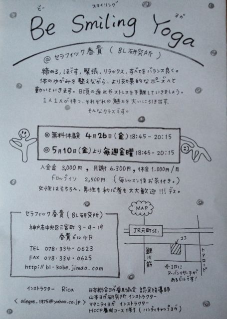 Be Smiling Yoga セラフィック春貴(BL研究所 玄米カフェ4階) 締める、ほぐす、緊張、リラックス、すべてをバランス良く。身体の歪みを整えながら、より効果的なポーズへと動いていきます。日頃の疲れやストレスを手放していきましょう。 ひとりひとりが持つ、それぞれの魅力を大いに引き出す、そんなクラスです。 ○無料体験 4月26日(金)18:45〜20:15 おまちしていま〜す ◎5月10日(金)より毎週金曜18:45〜20:15 入会金3,000円、 月謝6,300円、 休会1,000