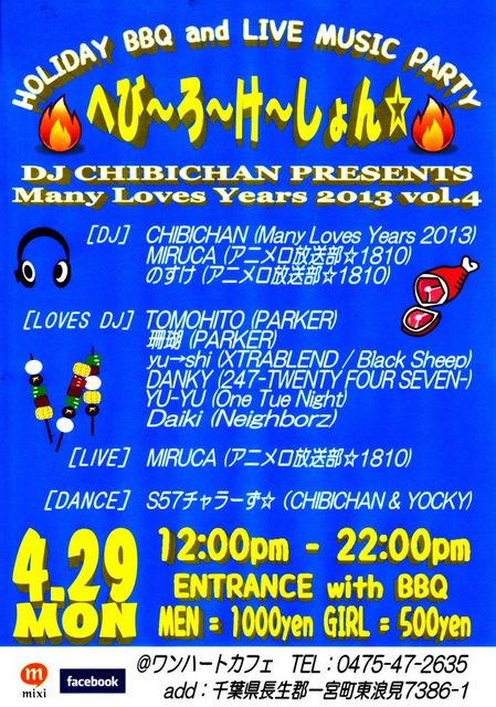 7年間、御愛顧頂き本当に有難う御座いました 移転前に感謝の気持ちを込め、ラストイベントを開催致します 15:00〜18:00 お店の前にてBBQ お一人様\1000 ドリンク半額 18:00〜ラスト ダーツ投げ放題 カラオケ歌い放題 お一人様\1000 ドリンク半額 おつまみも有るだけサービス 冷蔵庫&冷凍庫の中味を空っぽにしちゃいましょう 古着やリサイクル品を無料にて差し上げたり格安販売も致します 参加は何時からでもなので最後に皆で大騒ぎして盛上りましょう