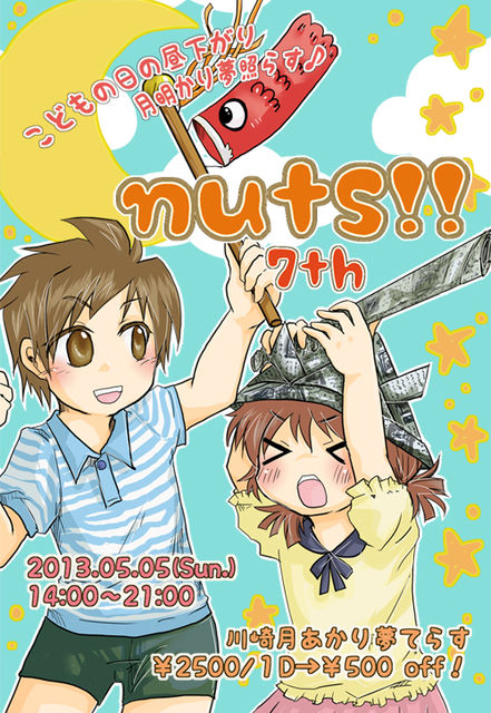 illust by りい 「うわ、なっつ!!」 ――――そんな声が、聞きたくて。 「懐かしければ、なんでもいいやー!」 そんなコンセプトに賛同したDJ陣……否、ただの懐古厨達にてお送りする、懐古方面ごった煮DJイベント『nuts!!』 第一回開催から一年半が経過し、二度目のこどもの日を迎える七回目! こどもの日らしく、こどもに優しいデイイベントとして! 渋谷を飛び出し、川崎月あかり夢てらすにて開催します! ■■■ nuts!! 7th 〜こどもデリバリー(仮)〜 ■■■ あのアニメが、あのドラマが、あ