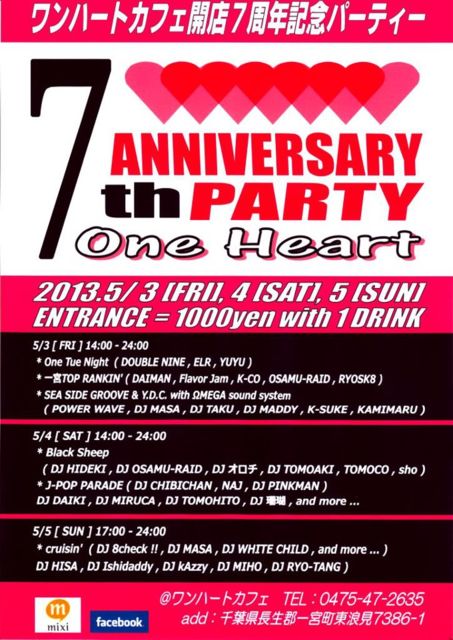 ワンハートカフェ開店7周年記念パーティー 「7th ANNIVERSARY PARTY One Heart」 @ワンハートカフェ Tel:0475-47-2635 Add:千葉県長生郡一宮町東浪見7386-1 【facebook】http://www.facebook.com/oneheart1810 【mixi】http://mixi.jp/view_community.pl?from=home_joined_community&id=1373713 【Tweetvite】http://tweetvite.com/event/tur3 2013年5月3日(金) OPEN 14:00 / START 14:30 / CLOSE 24:00 ENTRANCE = 1000yen with 1 DRINK 〇出演者〇 *One Tue Night ( DOUBLE NINE , ELR , YUYU ) *一宮 TOP RANKIN’ ( DAIMAN , F