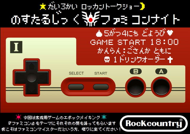 ロッカントークショー第三弾 『ノスタルジック・ファミコンナイト』 ★第三回トークイベント★ 『ノスタルジック・ファミコンナイト』が5/4に開催決定! 今回は家庭用ゲームのエポックメイキング、『ファミコン』をテーマに、それぞれの愛を語ってもらいます! 我こそはファミコンマイスターだという方、喋りに来てください!よろしくお願いします! START 18:00 1ドリンクオーダー ロッカン、トークショー第三弾は思い出いっぱいファミコン編! 盛り沢山の内容でお送りする抱腹絶倒のトークバトル! トークだけじゃない様々な切