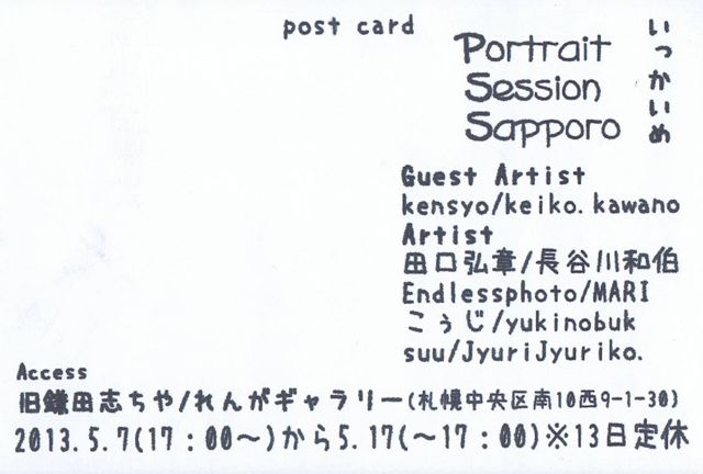 「portrait session sapporo」 ポートレイトの8人展です。 ゲストアーティストに kensyo / keiko kawano を迎えて、さらにそれぞれの個性が 際立つ写真展になっています。 5月7日(火)〜5月17日(金) 月曜休廊 場所:れんがギャラリー/カフェー 旧鎌田志ちや 12:00〜19:00 (最終日17:00まで) 札幌市中央区南10条西9丁目1-30 011-594-8681 http://www.tonden-street.com/ http://mixi.jp/view_community.pl?id=1204236
