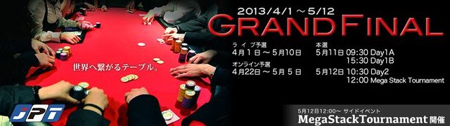 5/7(火)2013JPT GFサテin西麻布Nobu JPT(JAPAN POKER TOUR)はPOKER STARSがスポンサードする日本におけるPOKERトーナメントです。 JPT GF(5/11DAY1A)のサテライトです。 http://japanpokertour.jp/top/2013s1grandfinal ■日時:5月7日(火)18:45受付19:00スタートで開催 終了予定23時ごろ 2テーブル開催予定 参加費:5500円(会場費込み)(ワンドリンクオーダー制+500円) 場所:西麻布Nobu 港区西麻布1-4-26-101 TEL:03-3408-5866 西麻布交差点から徒歩3分 千代田線乃木坂駅5番出口より西麻布交差点方面へ徒歩5分