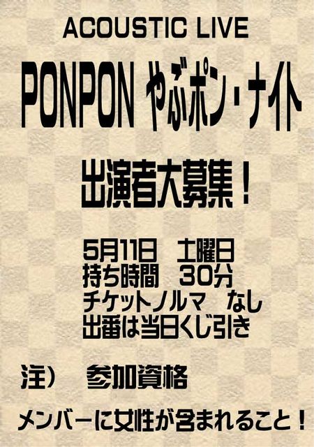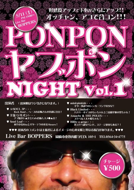 PON PON ¥ä¥Ö¥Ý¥ó NIGHT Vol.1 £µ·î£±£±Æü¡¡ÅÚÍËÆü £±£¹¡§£°£°¡¡START ¥Á¥ã¡¼¥¸¡¡¡ï£µ£°£° ½Ð±é¼Ô ¡ù¡¡A-SOUL 3P ¡¡¡¡¡ÊRock Band¡¢¥Ù¡¼¥¹¤Î¤ª»Ð¤µ¤ó¤Î¾Ð´é¤ËÃíÌÜ¡ª¡Ë ¡ù¡¡½Á²¹¡Ê¥¸¥ë¥ª¥ó¡Ë ¡¡¡¡¡Ê¥Ê¥ÞÃȤ«¤¤¢¥½Á¤ÈCafe´ÇÈĥॹ¥á¡ü¢¥²»¡ª¡Ë ¡ù¡¡Seed Leaf ¡¡¡¡¡ÊÁ֤䤫¤ÊRisa¤È¥®¥¿¡¼¥Æ¥¯¤Î¸÷¤ëMasaru!) ¡ù¡¡mini-pinkish ¡¡¡¡¡Ê¥®¥¿¡¼ÃƤ¸ì¤ê¤Î¥·¥ó¥¬¡¼¥½¥ó¥°Èþ¾¯½÷¡ª¡Ë ¡ù¡¡Black Limited ¡¡¡¡¡Ê¥Ï¥¹¥¡¼¥Ü¥¤¥¹¤Î¤Á¤£¤Á¤ã¤ó¤È¡û»³¼þÊ¿»÷¤Î¹õ¤Á¤ã¤ó¡ª¡Ë ¡ù¡¡Anaachy & THE POLES ¡¡¡¡¡Ê¥¹¥±¥Ù¤Ê£³¿Í+¿ú¤Á¤ã¤ó¡ª¡Ë