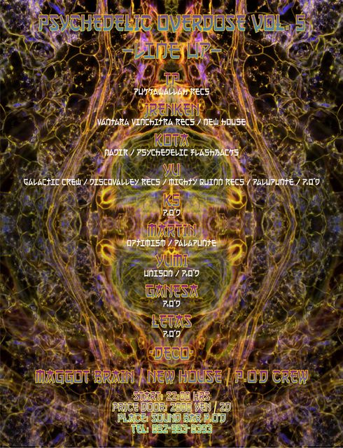 Dark Psychedelic , forest, Hi-tech Psychedelic Overdose¡¡Vol.£µ DATE¡§2013/5/11(Sat) START¡§22:00 DOOR¡§2000/2D PLACE¡§SOUND BAR P.O'd DJs TP(Pukkawallah rec) JRenKen(Vantara Vichitra Rec/new house) kota (nadar/psychedelic flashbacks) YU( Galactic Crew /DiscoValley Rec/ Mighty Quinn Rec/¥Ñ¥ë¥×¥ó¥Æ/P.O'd) K5(P.O'd) MARTIN(optimizm/¥Ñ¥ë¥×¥ó¥Æ) yumi(unison/P.O'd) Ganesa(P.O'd) ¥ì¥¿¥¹(P.O'd) DECO MAGGOT BRAIN/NEW HOUSE/P.O'd Crew Flyer design¡§ 4MACK °¦Ãθ©Ì¾¸Å²°»ÔÅì¶è