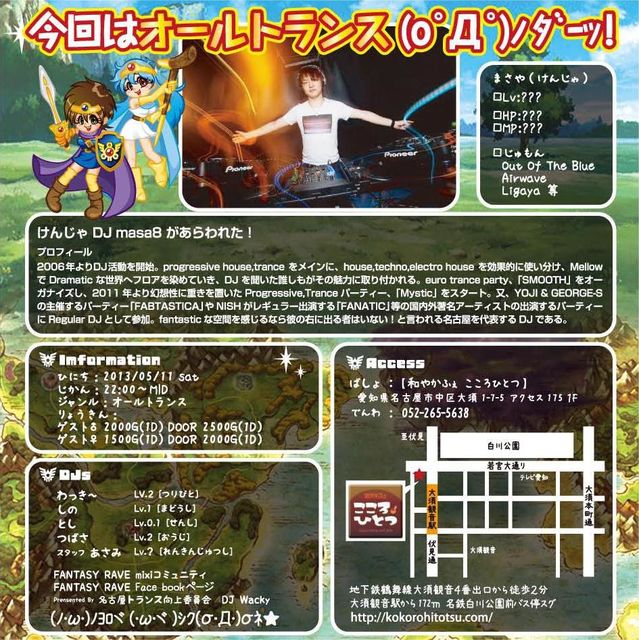 º£²ó¤Ï¥È¥é¥ó¥¹¥ª¥ó¥ê¡¼(Žß¢ÏŽß) ̾¸Å²°¤ÎÃϤ˳赤¤ò¼è¤êÌ᤻ ¤½¤·¤Æ¡¢Ì¾¸Å²°¤Ë¤Ï¤Ê¤«¤Ã¤¿¿·À¤³¦¤ò¸«¤¤¤À¤¹°Ù Å쳤Ã϶è¤òµòÅÀ¤È¤·¤¿Í¦¼Ô㤬½¸·ë ÂçÉÔ¶·¤È¤¤¤¦Ì¾¤ÎÂçËⲦ¤òÅݤ¹¤Ù¤¯Î©¤Á¾å¤¬¤Ã¤¿Ž¥Ž¥Ž¥¡£ [FANTASY RAVE]ά¤·¤Æ¡Ö¥Õ¥¡¥ó¥¿¡×¤Ï¡¢ ¥È¥é¥ó¥¹Ãæ¿´¤Î¥ª¡¼¥ë¥¸¥ã¥ó¥ë¥Ñ¡¼¥Æ¥£¡¼¡£ Âç¿Í¤â¼ã¼Ô¤â¤ª¤Í¡¼¤Á¤ã¤ó¤â³§°ì½ï¤Ë³Ú¤·¤á¤ë ¥¢¥Ã¥È¥Û¡¼¥à¥Ñ¡¼¥Æ¥£¡¼¤Ç¤¹ º£²ó¤Ï¥È¥é¥ó¥¹¥ª¥ó¥ê¡¼ ̾¸Å²°¤Ç³èÌöÃæ¤ÎDJ masa8¤ò¥²¥¹¥È¤Ë¸Æ¤Ó ²û¤«¤·¤Î¥¯¥é¥·¥Ã¥¯¥È¥é¥ó¥¹¡Ê¥µ¥¤¥Ð¡¼¥È¥é¥ó¥¹¡Ë ¤òÃæ¿´¤Ë¤¢¤Î