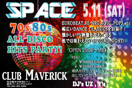 ¡ÖSPACE¡× 70s,80s ALL DISCO HITS PARTY! EUROBEAT,HI-NRG,SOUL,POPS,etc Éý¹¤¤DANCE CLASSICS¤ò¤ªÆÏ¤±¡ª ²û¤«¤·¤¤PV±ÇÁü¤ò¸ò¤¨¤ÆÁ÷¤ë ¾¤Ç¤ÏÌ£¤ï¤¨¤Ê¤¤SPECIAL NIGHT! À§Èó¡¢³§ÍͤΤª±Û¤·¤ò¤ªÂÔ¤Á¤·¤Æ¤ª¤ê¤Þ¤¹¡ª OPEN 21:00¡ÁMID FEE ¡¡¡é ¡ï3000(4Ticket¡Ë ¡¡¡ê ¡ï2500(3Ticket) ¢¨Æþ¤ê¸ý¤Ç¡¢DJ UZ,Y's¤Î̾Á°¤ò ½Ð¤·¤Æ¤¤¤¿¤À¤¯¤È500±ß³ä°ú¡ª¡ª DJ's UZ , Y's CLUB MAVERICK (µì̾¸Å²°King&Qeen,J-MAX) ̾¸Å²°»ÔÃæ¶è±É2-7-1 ÅìÍΥѡ¼¥¥ó¥°¥Ó¥ëB1F TEL:052-223-5200 http://www.club-ma