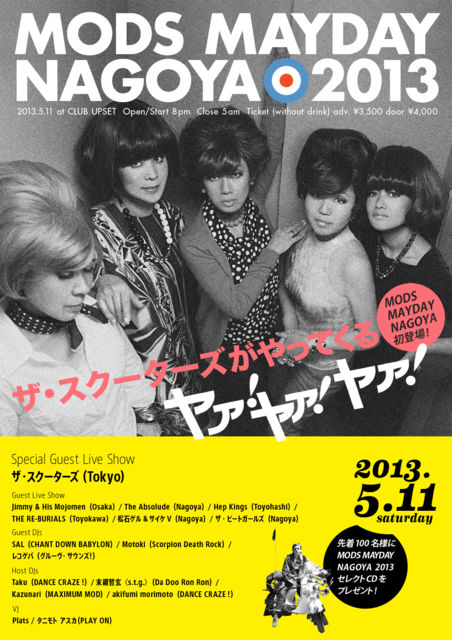 ¡ØMODS MAYDAY NAGOYA 2013¡Ù 1990ǯ¤ËÃÂÀ¸¤·¤Æ°ÊÍè¡¢Ëèǯ5·î¤Ë³«ºÅ¤µ¤ì³¤±¤Æ¤¤¤ë¡ØMODS MAYDAY NAGOYA¡Ù¤Ïº£Ç¯¤Ç24²óÌܤò·Þ¤¨¤ë¡£ ̾¸Å²°¥¨¥ê¥¢¤Î60s¥·¡¼¥ó¤Ç³èư¤¹¤ë¥Ð¥ó¥É¤ÈDJ¤Ë²Ã¤¨¡¢Á´¹ñ³ÆÃϤ«¤é¤â¥·¡¼¥ó¤Ç³èÌö¤·¤Æ¤¤¤ë¥²¥¹¥È¤ò·Þ¤¨¤Æ¤Î³«ºÅ¤È¤Ê¤ë¡¢¤Þ¤µ¤Ë̾¸Å²°¤ÎÁ´¤Æ¤ÎMODS¤ä60s¥Õ¥ê¡¼¥¯¡¢¥ô¥£¥ó¥Æ¡¼¥¸¡¦¥ß¥å¡¼¥¸¥Ã¥¯¥Õ¥¡¥ó¤Ë¸þ¤±¤¿¥¹¥Ú¥·¥ã¥ë¤Êº×ŵ¤Ç¤¢¤ë¡£ º£Ç¯¤Ï¡¢ºòǯ30ǯ¤Ö¤ê¤Ë¿·Éè¤ò¥ê¥ê¡¼¥¹¤·¤ÆÉü³è¤ò²Ì¤¿¤·¤¿ÅÁÀâ¤Î¥Ð¥ó¥É¡ã¥¶¡¦¥¹¥¯¡¼¥¿¡¼¥º¡ä¤òɮƬ¤È¤¹¤ë7¥Ð¥ó¥É¡Ü7DJ¤Î¹ë²Ú¥é¥¤¥ó¥Ê¥Ã¥×¤Ë¡¢Ì¾¸Å²°¤Î¼çÍ×MOD/60s¥¤¥Ù¥ó¥È¡ÖDA