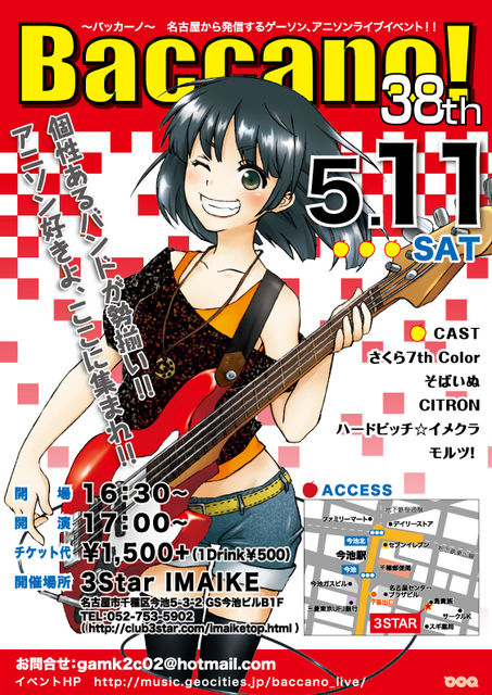 Baccano¡ª-38th- 2013/5/11(ÅÚ) OPEN¡§16:30¡¡START¡§17:00 ¾ì½ê¡§Imaike Club3star (̾¸Å²°»ÔÀé¼ï¶èº£ÃÓ5-3-2 GSº£ÃÓ¥Ó¥ëB1F) ¥Á¥±¥Ã¥È¡§¡ï1,500(1DrinkÊÌÅÓ¡ï500) 17:00¡Á ¤µ¤¯¤é£·th Color 17:50¡Á ¤½¤Ð¤¤¤Ì 18:40¡Á CITRON 19:30¡Á ¥Ï¡¼¥É¥Ó¥Ã¥Á¡ù¥¤¥á¥¯¥é 20:20¡Á ¥â¥ë¥Ä¡ª »þ´Ö¤ÏÌܰ¤Ȥʤê¤Þ¤¹¤Î¤Ç¤ªÌÜÅö¤Æ¤Î¥Ð¥ó¥É¤¬¸æºÂ¤¤¤Þ¤·¤¿¤é¤ª»þ´Ö¤Ë;͵¤ò¤â¤Ã¤Æ¤ª±Û¤·²¼¤µ¤¤¡£