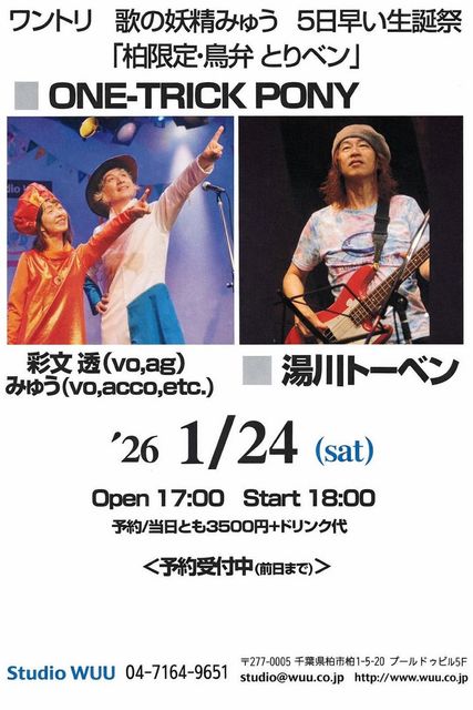 さて、次週は ワントリの歌姫、みゅうちゃんの 数日早めの生誕祭ライブです。 ご一緒させていただくのは 湯川トーベンさんです! みなさま、よろしくお願いいたします♪ ★2026.1.24(土) 柏「Studio WUU」★ https://www.wuu.co.jp/ 「ワントリ歌の妖精みゅう 5日早い生誕祭 『柏限定・鳥弁!とりベン』 出演:湯川トーベン https://hphana87hana.wixsite.com/website 新倉 愛 https://www.facebook.com/niikuraai おーいけみのり ONE-TRICK