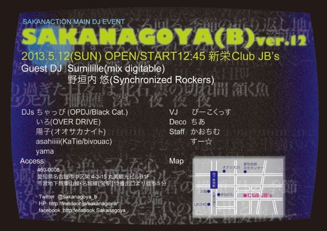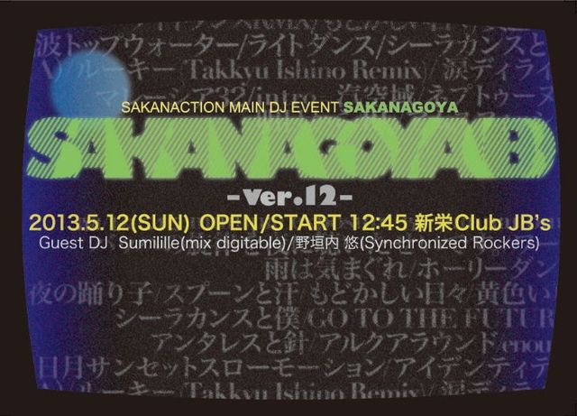 ++++++++++++++++++++++++++++++++++++++ 管理人様、失礼いたします。 サカナクションメインのDJイベント サカナゴヤ(B) が前回も大好評で終わることが出来ました! それも本当にみなさんのおかげです。 心より御礼申し上げます。 ニューアルバム&ツアーが春に行われるサカナクションの勢いそのままに4ヶ月ぶりにサカナゴヤ開催決定です! ■2013/5 /12(Sun) OPEN/START 12:45 ■CLUB JB'S 愛知県名古屋市中区栄4-3-15 丸美観光ビルB1 http://www.club-