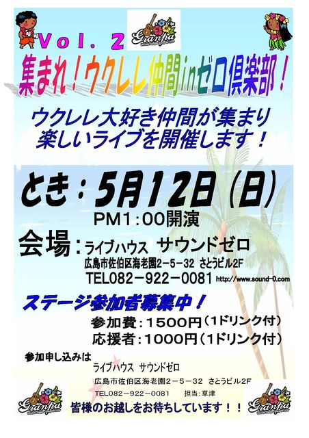 Vlo.2 集まれ!ウクレレ仲間inゼロ倶楽部開催! 昨年に引き続きウクレレだけのライブを開催いたします。皆さんでたのしみませんか? ただ今、ステージ参加者を募集しています! とき:5月12日(日)PM1:00開演 会場:ライブハウス サウンドゼロ 広島市佐伯区海老園2−5−32 さとうビル2F TEL082-922-0081 http://www.sound-0.com 参加費:1500円(1ドリンク付)/一人 (持ち時間3曲以内) 皆様のご参加お待ちしています。