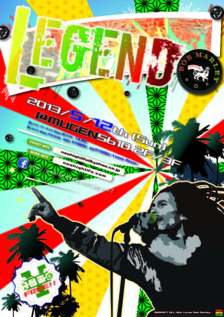 ★LEGEND★ ~bob marley~ vo.9 5月12日(土)@MUGEN5610 2F open 12:00 3F start 18:00 前売り¥1000円 当日¥1500円 (共に1Dオーダー) ※ママ&キッズ&ペット&ドレッドの方は無料! 毎年、ボブマーレーを愛する人達が集まり、ジャンルの壁を越え、自由にボブを感じるイベントです。彼の残したLOVE&PEACEの精神を、後世に伝えて行こう! ☆二階は昼からフリーマーケット&カフェ&占い。 (お花屋さん、古着屋さん、雑貨屋さん、CD、DVD、レコード屋さん、アクセサリー屋さん、骨董品屋さん、駄菓子屋さん、革細工屋さ