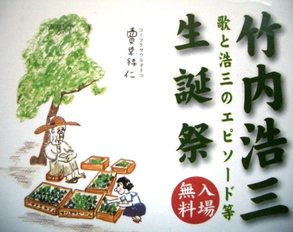 竹内浩三さんの生誕祭が開催されます。 午前中には、「竹内浩三」研究会があります。 ぜひ お運びください。 13日には浩三さんが入隊した津33連隊の 現自衛隊久居駐屯所への見学(または、伊勢朝熊山登山 お墓と詩碑があります) を計画中です。 歓喜して生きよ!ヴィヴェ・ジョアユウ (「五月のように」より) 【竹内浩三生誕祭】 2013年 5月12日 午後2時から3時半 ところ 伊勢市 赤門寺正寿院(宇治山田駅より徒歩15分) ?部 浩三のエピソードと朗読 詩人 渡辺正也 姪 庄司乃ぶ代 司会 藤田