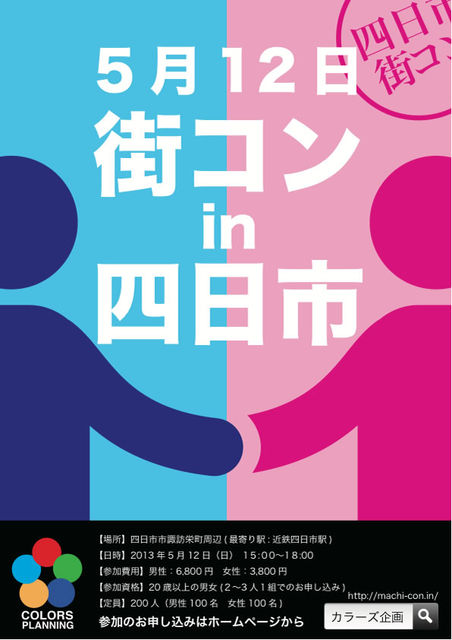管理人様、貴重なスペースをお借りし告知をさせていただきます。 皆さん初めまして、カラーズ企画といいます。 この度、5/12に近鉄四日市駅周辺で街コンを開催する事になりました。 街コン開催するにあたり、ボランティアスタッフを募集しています ★当日手伝って頂きたい事★ ?受付 ?お客様の誘導 盛り上がる仕組みを用意していますので、途中で分からない参加者の方への説明等、手伝って頂きたい内容は非常に簡単です。 四日市が大好きで四日市を盛り上げたい方、大勢でイベントを成功させたい方 是非一緒に「四日市街コン」を盛り