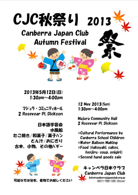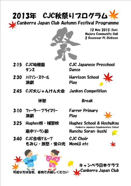 今年もCJC幼稚園や補習校&Hughes校、その他現地学校による日本語学芸会、水風船、たこ焼き、和菓子、トン汁、おにぎりなどなど盛りだくさんの予定です。