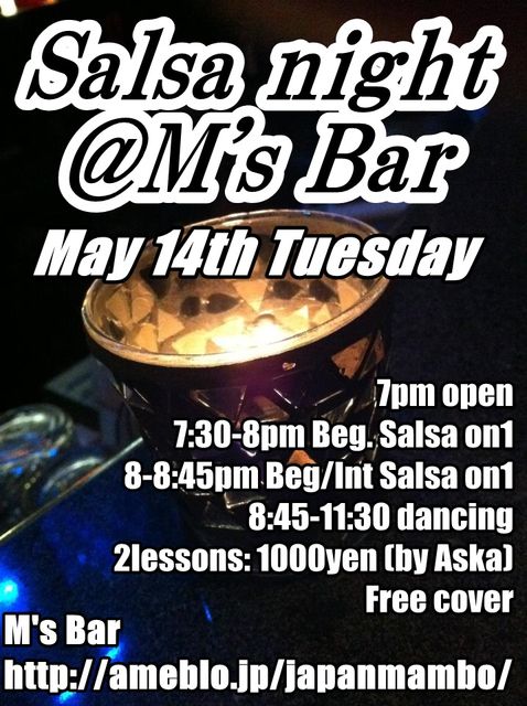 Salsa Night@南柏M's Bar 南柏駅西口すぐのアットホームなバー。 サルサ、メレンゲ、チャチャ、バチャタのリズムに乗って、 飲んで踊って笑って、素敵な夜を過ごしませんか 5月は第2、第4火曜日開催! 【日程】 2013年5月14日(火) 【時間】 19:00 オープン 19:30〜20:00 初級サルサON1レッスン 20:00〜20:45 初/中級サルサON1 レッスン 20:45〜23:30 フリーダンスタイム ※レッスンの後がっつり踊れます♪ ダンスレッスンありますので初心者さんもお気軽にご参加ください。 レディーススタ