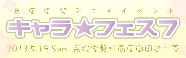 5月19日香川県高松市で開催される商店街発のアニメイベント『キャラ★フェス7』の中の企画、痛車を使った野外DJイベント『SssELF×Mo've〜夢舞〜』と【後夜祭】『おでかけSssELF』に関西からもDJ参加させて頂く事になりました。 関西からはMIX★BOMBのtamu、イズイシ BunGeee☆のサーモン太郎 with どいーん★ 期待の若手 モスクワ が参加します。 SssELF×Mo've〜夢舞〜 ◆参加費 無料 ◆時間 11:00-17:00 ◆場所 4町パティオ[地図] (※雨天時は痛車未使用で開催場所が変更されます。詳細はキャラフェスのパ