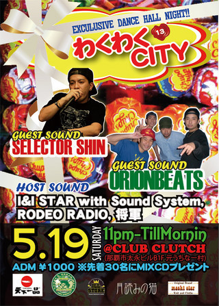 REGGAE DANCEHALL 「わくわくCITY Vol 13」 2012年 5月19日(土) 23:00〜 @CLUB CLUTCH (那覇市 国際通り) ADM:1000円 ※先着30名にMIX CDプレゼント! ■Guest ・SELECTOR SHIN ・ORION BEATS ■SOUND ・RODEO RADIO ・勝軍 ・I&I STAR with Sound System ■INFO I&I STAR [BLOG] http://iandiphoto.ti-da.net/ 5月のわくわくCITYは1周年を迎えたParty Rock Tuesdayより、沖縄市の盛り上げ番長!SELECTOR SHINが満を持して登場!今回も「ガッチリ」踊れそうです!そして那覇からは初登場ORION BEAT