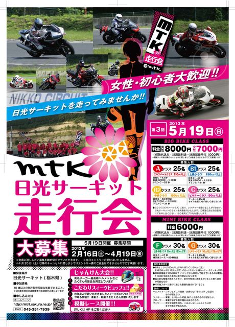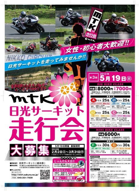 MINI BIKE CLASS大募集中!!! 2013年5/19(日) 【MTK日光サーキット走行会開催!!】 のご案内 ※ 管理人ACEさんの承諾をいただきまして、こちらのコミュにてご案内させていただきます ご興味ありましたら是非ご参加くださいねぇ〜 見学も大歓迎です 今年もやっちゃいますよぉ〜 2013年度はミニバイククラスを2クラス増設しての開催です MTK走行会の概要 開催予定日・参加費: 第3回 平成25年5月19日(日) 募集期間:2月16日(土)〜4月19日(金) 2月