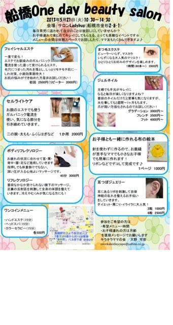 毎日育児に追われて自分のことは後回しにしていませんか? お子様連れで楽しめてキレイにしてもらえる、とっても素敵なイベントをキラキラママの会で企画しました☆ メニューの合間は休憩スペースでお茶やランチをしながら、ママ友もできますよ! 日にち:2013年5月21日(火) 時間:10:30〜14:30 会場:サロンLadybug(船橋市金杉2丁目) ☆メニュー☆ *フェイシャルエステ 一度で変化! エステでお馴染みのガルバニック電流を使った座って受けるエステ。 毛穴につまった汚れを落とし、しっとりモチモチ肌に… しわ対策、