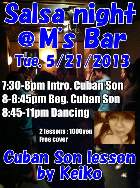 Salsa night @南柏M's Bar スペシャルゲスト、九州で活躍中のKeiko先生によるソンレッスン! レッスンの後はサルサ、ソン、バチャータ、メレンゲ、チャチャで踊って、飲んで、語って楽しみましょう! 【日程】 2013年5月21日(火) 【時間】 19:00 オープン 19:30〜20:00 入門ソンレッスン (Keiko) 20:00〜20:45 初級ソンレッスン (Keiko) 20:45〜23:30 フリーダンスタイム 【費用】 ダンスレッスン 1000円 (by Keiko 2レッスン込) エントランス 無料 ☆ソフトドリン