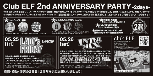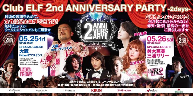 5月25日金曜日!! 遂に渋谷club ELFが2周年 を迎えます!! ★club ELF 2nd ANNIVERSARY PARTY★ Special GUEST DJにケツメイシの大蔵を迎え、盛大にお送りします!! エントランスでこちらの画面をご呈示いただければ、 下記のスペシャルディスカウント料金でご入場いただけます -------------------------------------- 5/25(FRI) 女性無料! 男性1,000/0D 5/26(SAT) 女性1,000/2D 男性1,500/1D -------------------------------------- ★2周年を記念して•••