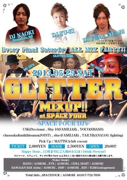 管理人様告知失礼致します。 2013/05/25sat ALLMIXPARTY GLITTER@SPACEFOUR 22:00OPEN!! MAINDJS DJNAOKIjinnan.co.ltd DJYU-KI←BESTHITS54Release!! MCs Lil'k(advisorybooth) MOMO SPACEFOURDJS USK(PRESIOUS)shy-10(FAMILIA)YOCO(SMASH) chansaka&mikihisumn(JOINT)shu(FAMILIA)TAICHI(advisorybooth) TICKET 2000yen Door2500yen Happyhour 24:00までご来場で+1DRINK!! ※スウェット、ジャージ、サンダルでのご来場をお断りします。また他お客様のご迷惑とみなされるお客様のご入場をお断りす