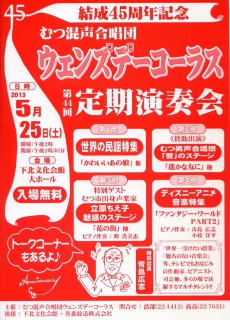 下北半島唯一の混声合唱団ウェンズデーコーラスの定期演奏会です♪ 今回の構成は… 第1部:世界の民謡←まぁ、これは前菜(笑) 第2部:歌と酒をこよなく愛してやまない男声合唱団『響』がゲスト出演♪ 第3部:むつ市出身の声楽家・立原ちえ子ステージ♪ 第4部→ディズニーメドレー「ファンタジー・ワールドPART2」←下北初演!オススメ!(^^)/ 特に今回は… 「題名のない音楽会」や「世界一受けたい授業」でおなじみの青島広志さんが特別出演します!! 楽しいトークと音楽が満載のコンサートです☆ こんなに盛り
