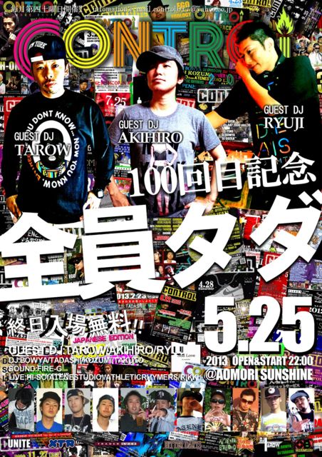2013.5.25 CONTROL @AOMORI SUNSHINE 毎月第四土曜日開催CONTROL 今回の開催でついに100回目を迎えるコントロール!2004年、青森市ライオンハウスからスタート。スペースフォー、ブレインでのパーティーを経て、サンシャインで記念すべきvol.100。 感謝の意を込めて、なんと...全員タダ!入場無料!ENTRANCE FREE! 更に、ゲストDJが三組! 青森、弘前、八戸など県内各地で活躍中のDJ TAROW。当イベントに出演する度にフロアを揺らしてくれるDJ AKIHIRO。青森HIPHOP界の重鎮、DJ RYUJI。 この記念すべき日にこのメンツ!酒と音が飛び交う