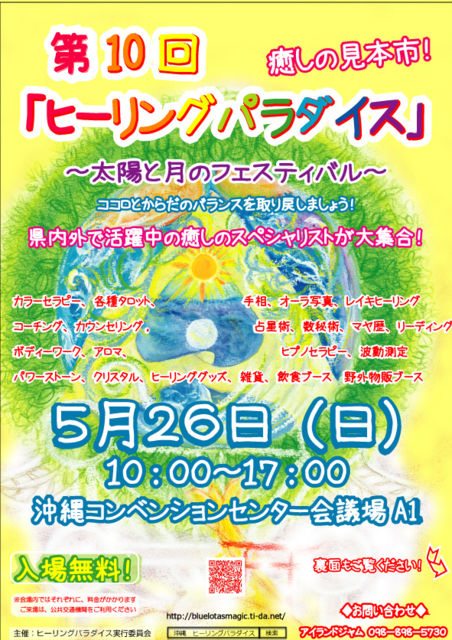 第10回沖縄ヒーリングパラダイス 5月26日(日)10:00〜17:00 沖縄コンベンションセンターA1会議室 ※噴水の前、真ん中の建物です 入場無料! ※気になるセラピーがイベント特別料金〜ワンコイン(500円)より体験できます♪ ヒーリング・パラダイスとは? 癒しの大展示会 ヘルス&ビューティ&スピリチュアルを統合する癒しの島プロジェクト 今話題の各種セラピーや代替療法を気軽に体験していただき 心身の健康やスピリチュアルなことやヒーリングに興