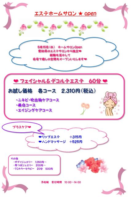 £µ·î£±£µÆü¡Ê¿å¡Ë¥¨¥¹¥Æ¥Û¡¼¥à¥µ¥í¥ó¥ª¡¼¥×¥ó¤Ëȼ¤¤¡¢ ¥Õ¥§¥¤¥·¥ã¥ë¡õ¥Ç¥³¥ë¥Æ¥¨¥¹¥Æ³Æ¥³¡¼¥¹£±²ó7,350±ß¤ò 2,310±ß¡ÊÀǹþ¡Ë¤Ë¤Æ¤ª»î¤·¥¥ã¥ó¥Ú¡¼¥ó¤ò¹Ô¤¤¤Þ¤¹¡£ ¡¡¡¡¡¦¥Ë¥¥Ó¡¦¿á½Ðʪ¤¬µ¤¤Ë¤Ê¤ëÊý¡£ ¡¡¡¡¡¦»ç³°ÀþÂкö¡¦ÈþÇò¥±¥¢¤·¤¿¤¤Êý¡£ ¡¡¡¡¡¦¥·¥ï¡¦¤¿¤ë¤ß¤¬µ¤¤Ë¤Ê¤ëÊý¡£ £³¤Ä¤Î¥³¡¼¥¹¤ò¼è¤ê·¤¨¤Æ¤¤¤Þ¤¹¡£ ´°Á´Í½ÌóÀ©¤Ç10»þ¡Á14»þ¤Þ¤Ç¤Î¼õÉÕ»þ´Ö¤È¤Ê¤ê¤Þ¤¹¡£ ¾ÜºÙ¤Ï¥á¥Ã¥»¡¼¥¸¤¤¤¿¤·¤Þ¤¹¤Î¤Ç¡¢¤ªµ¤·Ú¤Ë¤´»²²Ã¤¯¤À¤µ¤¤¡£