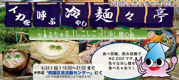 インターネット番組「イカを呼ぶ!」の食べ・呑み・遊び放題イベント! 6月のイベントは、6月23日(日) 『ちゅるちゅる、しこしこっ!冷やし麺の会』に決定。 メン好き、イケメン好き、イカメン好き、 みんな寄っといで!酔っといで! そう!今月はちゅるちゅると、 そうめん、おそばなどの麺類を食べながら、 お酒のもう♪見つけよう♪素敵なサムシング♪な会です。 ※ちなみに、4月のイベント「葉桜の会」の動画はこちら! ▼日時:6月23日(日)13時〜21時頃まで (途中参加、途中抜けなど全然OK!) ▼場所:桃園
