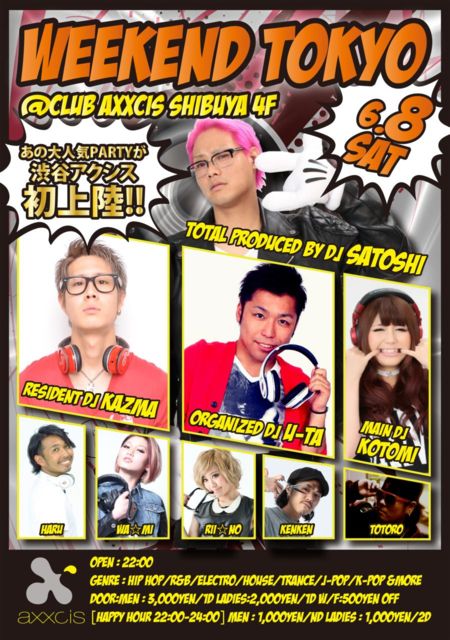 -WEEKEND TOKYO- 2013.6/8(SAT) @ club axxcis SHIBUYA 4F エントランスにて【トトロのゲストでトトロ】と伝えていただくだけでゲスト料金でご案内!! ※Every Sraturday Party ※OPEN:22:00〜MIDNIGHT ※DOOR :♂3000/1D ♀2000/1D ※W/F :♂2500/1D ♀1500/1D ※HAPPY HOUR (22:00~24:00) : ♂1000/ND ♀1000/2D ※Genre : HIP HOP/R&B/ELECTRO/HOUSE/TRANCE/J-POP/K-POP &more Resident DJ : KAZMA Organized DJ : U-tA Main DJ KOTOMI DJ's : HARU / Wa☆Mi / Rii☆NO / KENKEN / HASE☆YUMI / ToToR