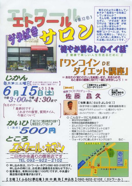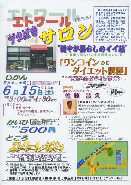 ¡½ º£·î¤Î¥Æ¡¼¥Þ ¡½ ¡¡¤³¤ì¤Þ¤Ç¤ÎÉü½¬¡¢¼ÁÌ䥿¥¤¥à¡¢º£¸å¤Ë¤Ä¤¤¤Æ ¡Ô Æü¡¡»þ ¡Õ ¡¡£¶·î£±£µÆü(Âè»°ÅÚÍËÆü) ¸á¸å£³:£°£°¤«¤é¸á¸å£´:£³£°¤Þ¤Ç ¡Ô ¹Ö¡¡»Õ ¡Õ ¡¡·ò¹¯¤Å¤¯¤ê¥×¥í¥Ç¥å¡¼¥µ¡¼º´¡¡Æ£¡¡¾»¡¡µ×¡Ê ¤µ¤È¤¦ ¤è¤·¤Ò¤µ ¡Ë ¡Ô ²ñ¡¡Èñ ¡Õ ¡¡£±¹ÖºÂ¡¡£µ£°£°±ß ¡¡¡¡¢¨ Ê̤ˤҤȤİû¤ßʪ¤«¿©¤Ùʪ¤òÃíʸ¤·¤Æ²¼¤µ¤¤¡£ ¡Ô ²ñ¾ìµÚ¤Ó¿½¤·¹þ¤ßÀè ¡Õ ¡¡ÆóÆü»ÔÃæ±ûÄ̤꾦ʳ¹¤ÎµÊÃãŹ ¡¡¡¡¡Ö¥¨¥È¥ï¡¼¥ë¡¦¥Û¥¢¥·¡×ÅÅÏÃ,£°£¹£²-£¹£²£²-£²£±£°£² ¡¡¡¡¡¡¡¡¡¡¡¡¡¡¡¡¡¡¡¡¡Ô ¤Õ¤ë¤µ¤ÈÌ´¹¾ì ¡ÕÅÄ¡¡Ãæ¡¡Å´¡¡Ìï